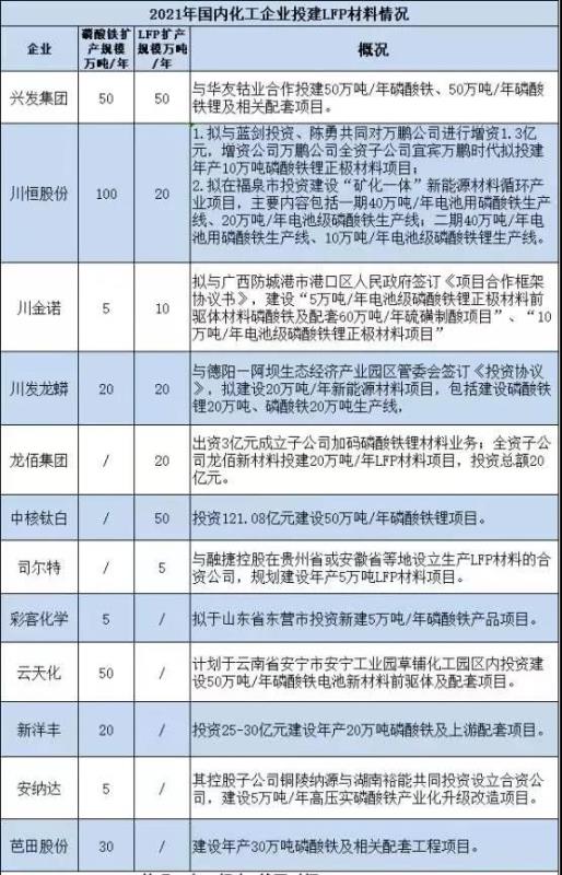 2021年以來,包括石油化工、氟化工、磷化工、鈦白粉化工等巨頭紛紛投擲重金,大手筆奔襲入場鋰電材料,涉及LFP材料、電解液、鋰鹽、添加劑等多領(lǐng)域。