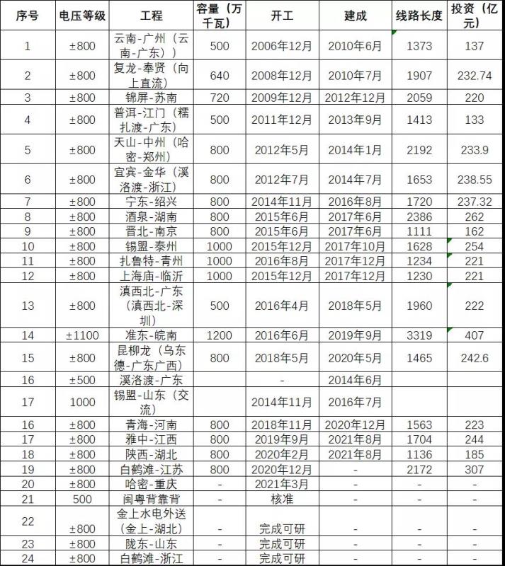 當前,我國建成、在建和完成可研的特高壓直流如表1: