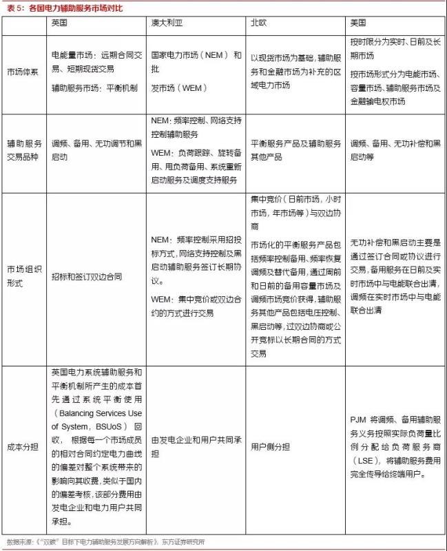以美國、英國、澳大利亞、北歐為代表的國家電力市場發(fā)展成熟,主要產(chǎn)品是調(diào)頻、備用、無功調(diào)節(jié)、黑啟動等,市場通過競價或長期協(xié)議的方式交易,服務費用通過輸配電價傳導到用戶側(cè)由終端電力用戶承擔。市場機制更為合理,更能體現(xiàn)電力輔助服務的實際價值。