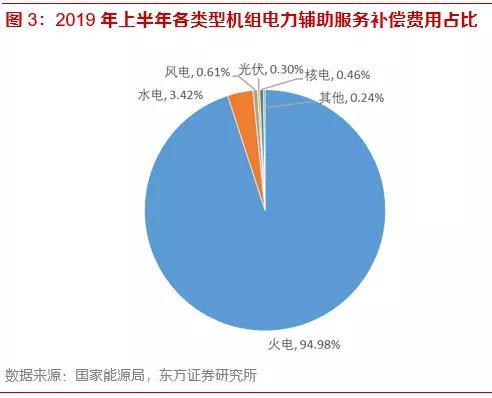 目前我國的電力輔助服務由發(fā)電側(cè)提供,主要是火電廠,其次是水電廠。根據(jù)國家能源局公布的數(shù)據(jù),2019年上半年,電力輔助服務市場補償費用共130.31億元,占上網(wǎng)電費總額的1.47%。其中,火電機組的補償費用占比為94.98%,水電站占比為3.42%。