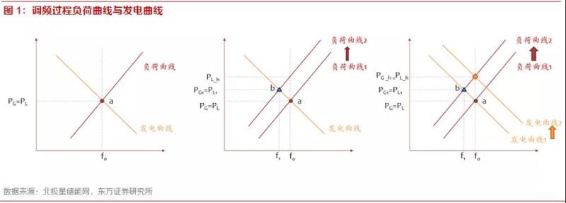 負荷側(cè)功率越大,頻率越高,可以看作一條右上方傾斜的線;發(fā)電側(cè)功率越大,頻率越低,可以看作一條右下方傾斜的線。當系統(tǒng)穩(wěn)定運行時,系統(tǒng)的功率和頻率處于負荷曲線和發(fā)電曲線的交點a。