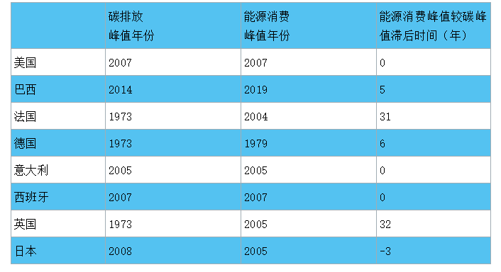 碳排放與能源消費量和能源結(jié)構(gòu)相關(guān)。碳排放達到峰值并不必然要求能源消費達到峰值,但從經(jīng)驗來看,多數(shù)國家在碳達峰前后或一段時期后會出現(xiàn)能源消費峰值。在典型國家中,除日本具有特殊性外,其他國家都在碳排放達峰的同年或其后出現(xiàn)能源消費峰值。美國、意大利、西班牙的能源消費峰值與碳達峰同年出現(xiàn)。巴西、德國的能源消費峰值時間晚于碳達峰5年-6年。法國、英國在上世紀實現(xiàn)碳達峰,在本世紀實現(xiàn)能源消費達峰,時間相差30年以上。