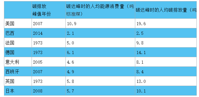 表3 典型國家碳達峰時人均能源消費量與人均碳排放量