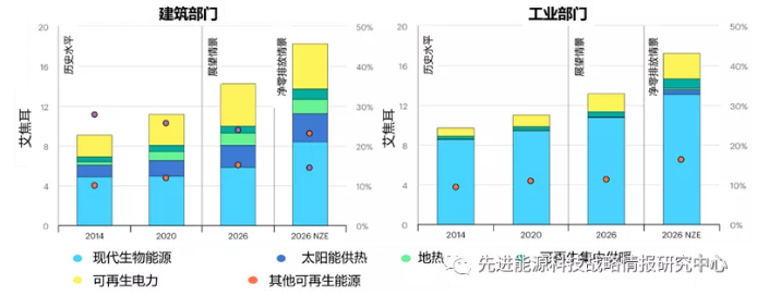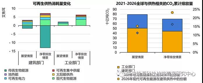 圖8 至2026年建筑部門與工業(yè)部門可再生能源供熱能耗及其在供熱需求中的占比預(yù)測(cè)