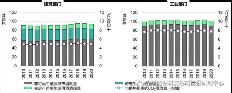 圖7 2010-2020年建筑部門與工業(yè)部門可再生和不可再生供熱能耗及相關(guān)CO2排放量