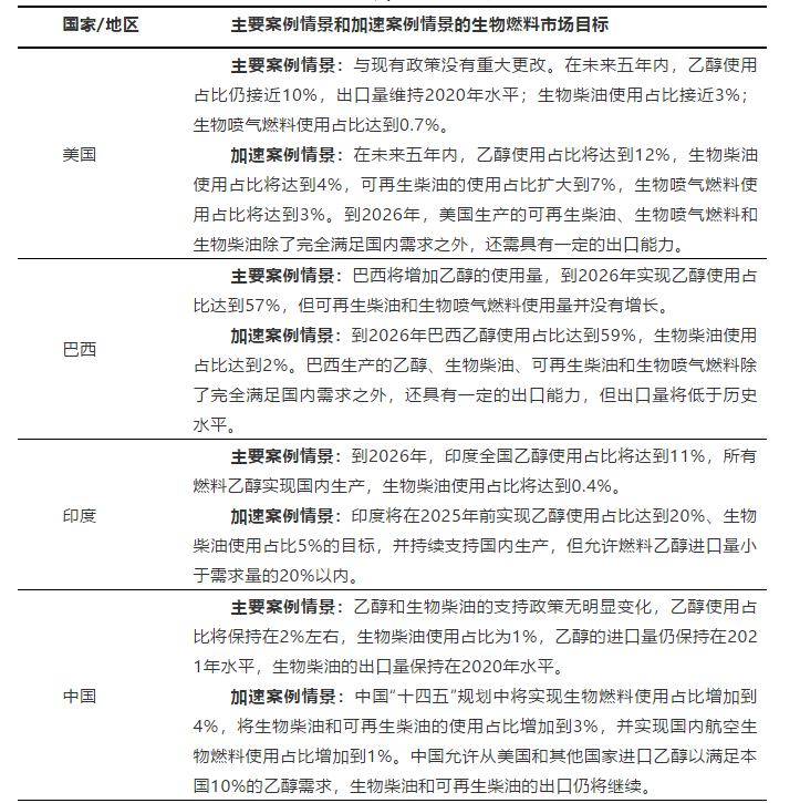 主要案例情景:加拿大將在2022年實(shí)施清潔燃料標(biāo)準(zhǔn);馬來(lái)西亞將在2023年開(kāi)始實(shí)施;泰國(guó)到2026年前將實(shí)現(xiàn)生物燃料使用占比達(dá)到15%,其中生物柴油使用占比將增加到10%;新加坡可再生柴油和生物噴氣燃料生產(chǎn)規(guī)模將擴(kuò)大;阿根廷生物柴油使用占比將維持在5%,乙醇使用占比將增加到12%;哥倫比亞到2022年乙醇使用占比將恢復(fù)到10%,到2026年生物柴油使用占比將維持在10%左右。
