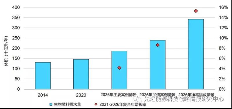 圖6 至2026年不同情景預(yù)測(cè)的生物燃料需求量增長(zhǎng)情況