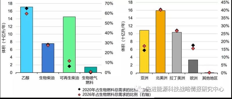 圖5 2021-2026年不同種類(左)和不同地區(qū)(右)生物燃料需求增長(zhǎng)預(yù)測(cè)