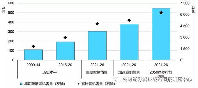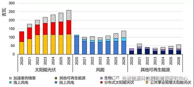 圖3 至2026年主要案例情景和加速案例情景中太陽(yáng)能光伏、風(fēng)能和其他可再生能源年度新增裝機(jī)規(guī)模預(yù)測(cè)
