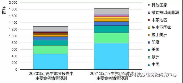 圖2 2020和2021年報(bào)告主要案例情景對(duì)未來(lái)五年不同國(guó)家/地區(qū)可再生電力裝機(jī)容量預(yù)測(cè)
