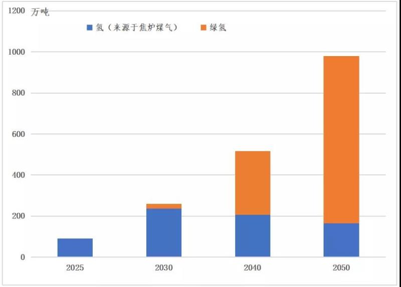 氫氣作為氫冶金的基本原料,其供求關系直接影響氫冶金推進的程度。綜合我國鋼鐵行業(yè)政策規(guī)劃、專家訪談及數據分析,預計到2030年氫冶金產量為0.21-0.29億噸,約占全國鋼鐵總產量的2.3%-3.1%?;跉湟苯鸬臍錃庑枨蠹s為191-259萬噸。氫冶金用氫需求中約92%來自焦爐煤氣,剩余約8%來自電解水制氫。到2050年,氫冶金鋼產量為0.96-1.12億噸,基于氫冶金的氫氣需求約為852-980萬噸。其中焦爐煤氣提供166萬噸氫,剩余814萬噸來自于綠氫。