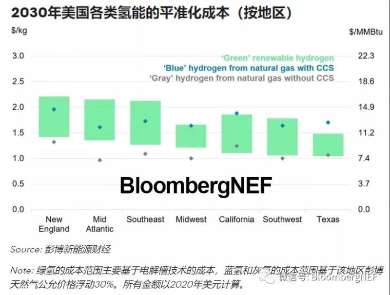 到2030年,美國(guó)綠氫的生產(chǎn)成本將接近1美元/千克。由于可再生能源和相關(guān)設(shè)備的成本下降,到2030年,清潔電力制綠氫的平準(zhǔn)化成本將低于用碳捕集與封存技術(shù)以天然氣制藍(lán)氫。生產(chǎn)綠氫的最低成本將出現(xiàn)在可再生能源電力最便宜的地區(qū),比如得克薩斯州和美國(guó)西南部。