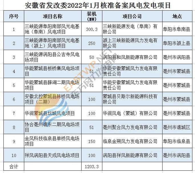 中國儲能網(wǎng)訊:1月11日,安徽省發(fā)改委一次性發(fā)布10個(gè)風(fēng)電項(xiàng)目核準(zhǔn)前公示,共計(jì)1203.3MW。其中,三峽集團(tuán)以700.3MW核準(zhǔn)量位居第一;金風(fēng)科技150MW第二;華能集團(tuán)102MW第三。