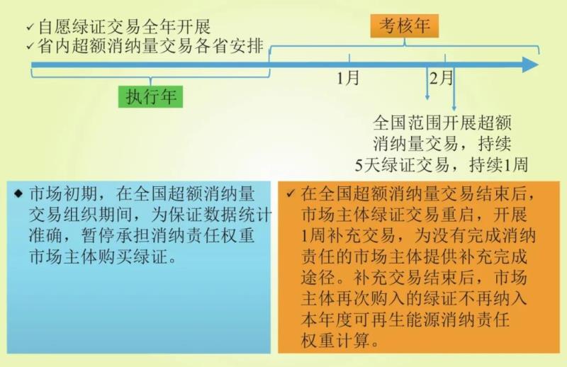 在市場運(yùn)行初期,原則上只開展年度交易,每年一月中旬結(jié)算工作完成后組織開展上年度超額消納量交易;市場成熟后可逐步開展季度、月度或日交易。各省級(jí)政府可根據(jù)情況確定本地區(qū)省內(nèi)交易周期,但需要與全國交易保持銜接。