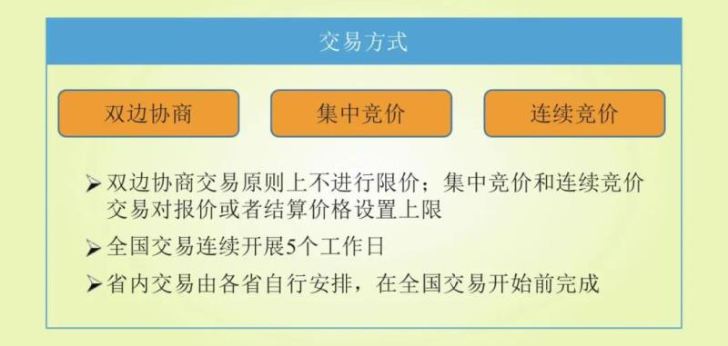 其中,全國交易方式包括雙邊交易、集中競價(jià)和連續(xù)競價(jià)交易,連續(xù)開展5個(gè)工作日。每工作日09:00—17:00開展雙邊協(xié)商交易;每工作日上午09:00—9:30開展集中競價(jià)交易,09:30—17:00開展連續(xù)競價(jià)交易,集中競價(jià)交易階段未成交部分的消納量自動(dòng)進(jìn)入連續(xù)競價(jià)交易階段。省內(nèi)交易的交易方式由各省自行安排,在全國交易開始前完成。