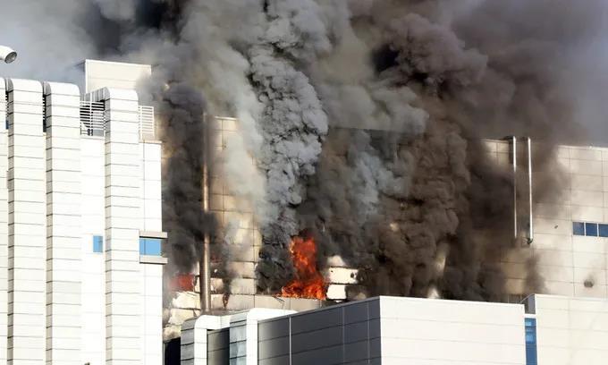 現(xiàn)場畫面顯示,該汽車電池工廠占地較大,火勢從工廠高層傳出,蔓延迅速?,F(xiàn)場曾傳出爆炸聲,從該工廠升起的巨大煙團在遠處依然清晰可見。在旁建筑也受到火勢波及,屋頂出現(xiàn)破損。