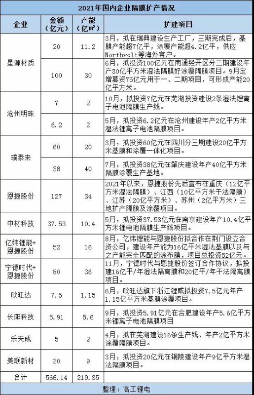 中國儲能網訊:高工鋰電依據公開信息整理,2021年國內隔膜企業(yè)規(guī)劃擴建產能(含涂覆產能)約220億平方米,投資總金額超560億元。