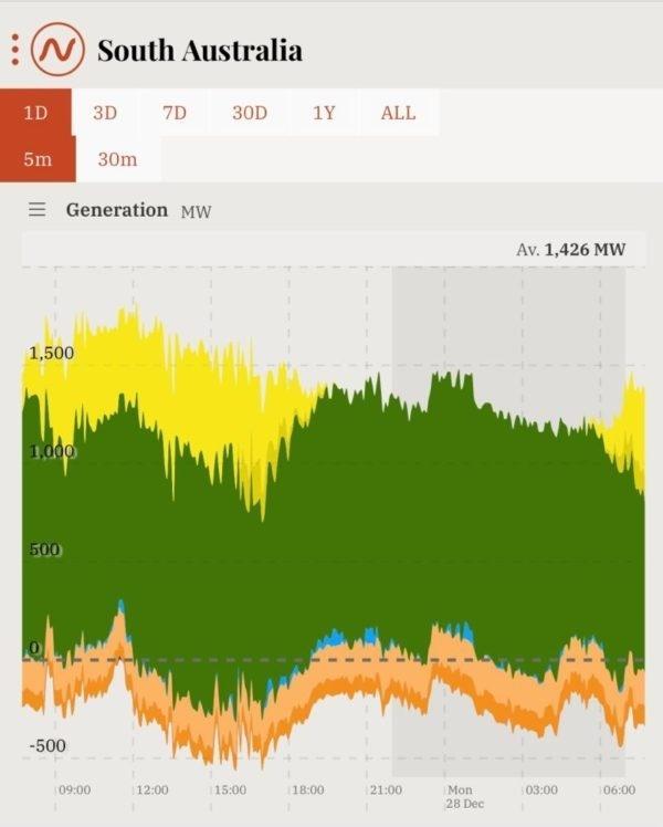 根據(jù)能源分析師 Geoff Eldridge 的分析,在確定的六天里,該州平均 101% 的能源來自風(fēng)能、屋頂太陽能和太陽能發(fā)電場(chǎng),只有一小部分能源來自天然氣,以保持電網(wǎng)的穩(wěn)定。