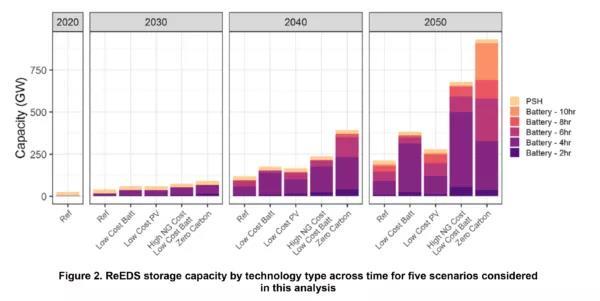 該文章旨在分析儲能對電網(wǎng)的一些影響,在2050年向五個獨特的情景發(fā)展。分析的情景包括參考情景,情景假設(shè)等,NREL檢查了以下四種情況: