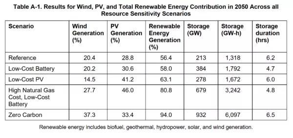 如上表 A-1 所述,參考情景也包括大量風(fēng)能和太陽能——分別占美國全部電力的20.4%和28.8%。