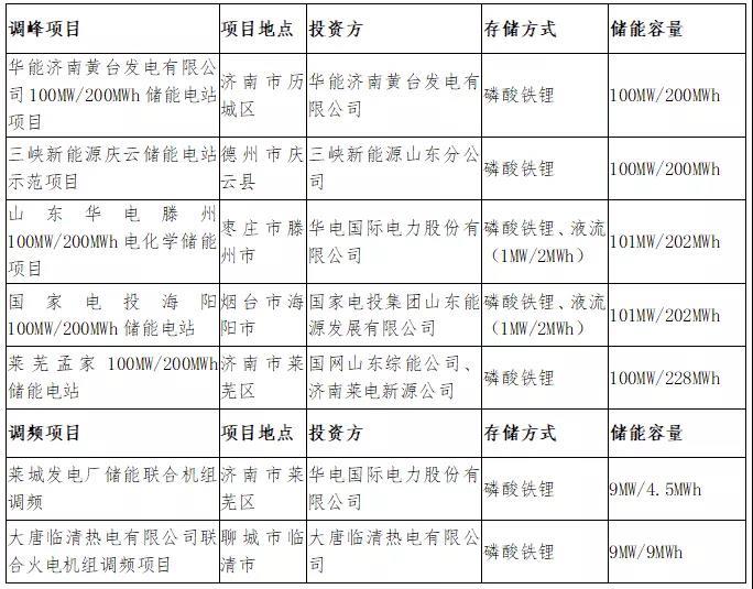 山東省在全國(guó)率先發(fā)布了省級(jí)儲(chǔ)能指導(dǎo)意見(jiàn)《關(guān)于開(kāi)展儲(chǔ)能示范應(yīng)用的實(shí)施意見(jiàn)》,在實(shí)施意見(jiàn)中發(fā)布了儲(chǔ)能參與輔助服務(wù)、租賃給新能源場(chǎng)站、獎(jiǎng)勵(lì)優(yōu)先發(fā)電量計(jì)劃的組合政策,確定了充放電量損耗部分按工商業(yè)及其他用電單一制電價(jià)結(jié)算的方式,初步建立了盈利模式,由此帶動(dòng)了示范項(xiàng)目的建設(shè)。首批五加二示范項(xiàng)目如下表: