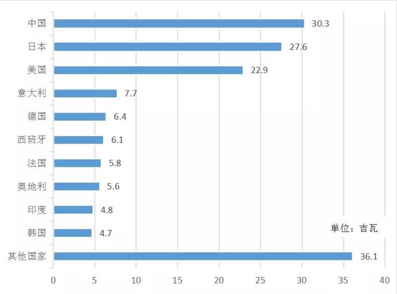 國(guó)際水電協(xié)會(huì)(IHA)數(shù)據(jù)顯示,截至2019年底,全球抽水蓄能總裝機(jī)容量接近160吉瓦,占全球儲(chǔ)能裝機(jī)容量的94%以上,占電網(wǎng)級(jí)儲(chǔ)能的96%以上。大部分抽水蓄能設(shè)施在歐洲和亞洲運(yùn)營(yíng)。其中,中國(guó)抽水蓄能裝機(jī)規(guī)模占世界總量的19%,居世界第一,其次是日本和美國(guó)(見圖2)。