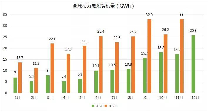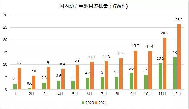 中國儲(chǔ)能網(wǎng)訊:2021年,我國動(dòng)力電池裝機(jī)量154.5GWh,同比增長142.8%。其中12月份裝機(jī)量達(dá)到26.2GWh,創(chuàng)歷史新高,同比增長102.4%。
