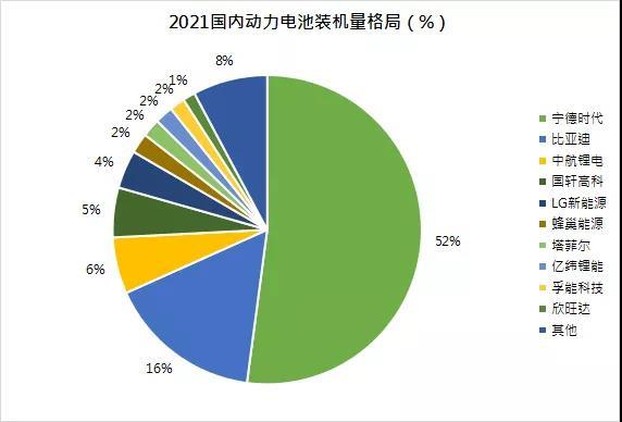 從市場份額來看,寧德時(shí)代繼續(xù)保持較大的市場優(yōu)勢,2021年國內(nèi)市場份額 52.1%。其他進(jìn)入前十的鋰電上市公司有:比亞迪、國軒高科、億緯 鋰能、孚能科技和欣旺達(dá)等。
