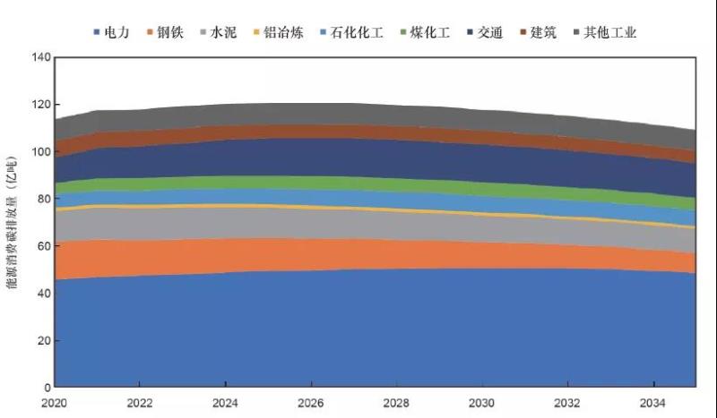 未來10年是中國基本實(shí)現(xiàn)現(xiàn)代化的關(guān)鍵階段,工業(yè)化、城鎮(zhèn)化、信息化等多重發(fā)展將帶來碳排放增長剛性壓力。如圖2所示,基于行業(yè)/領(lǐng)域核算結(jié)果,在采取積極措施情況下,中國能源活動(dòng)和工業(yè)過程的直接碳排放有望于“十五五”中后期達(dá)峰,較2020年增加5億~7億噸左右,由于行業(yè)達(dá)峰不同步,達(dá)峰后碳排放將保持3~4年的峰值平臺(tái)期。
