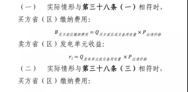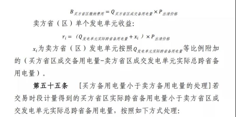 第五十三條 [買賣雙方備用電量平衡的處理]若交易時段計量得到的買方?。▍^(qū))實際跨省備用電量等于賣方省(區(qū))成交發(fā)電單元實際總跨省備用電量,買方省(區(qū))按照成交備用容量和市場出清價格向賣方?。▍^(qū))成交發(fā)電單元支付備用容量購買費(fèi)用。