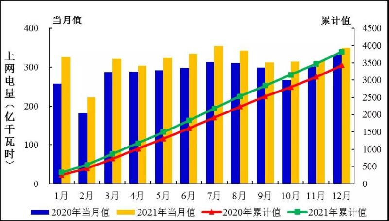 圖3:2020、2021年1-12月全國運(yùn)行核電機(jī)組上網(wǎng)電量趨勢