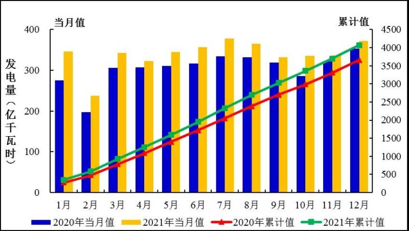 圖2:2020、2021年1-12月全國運(yùn)行核電機(jī)組發(fā)電量趨勢