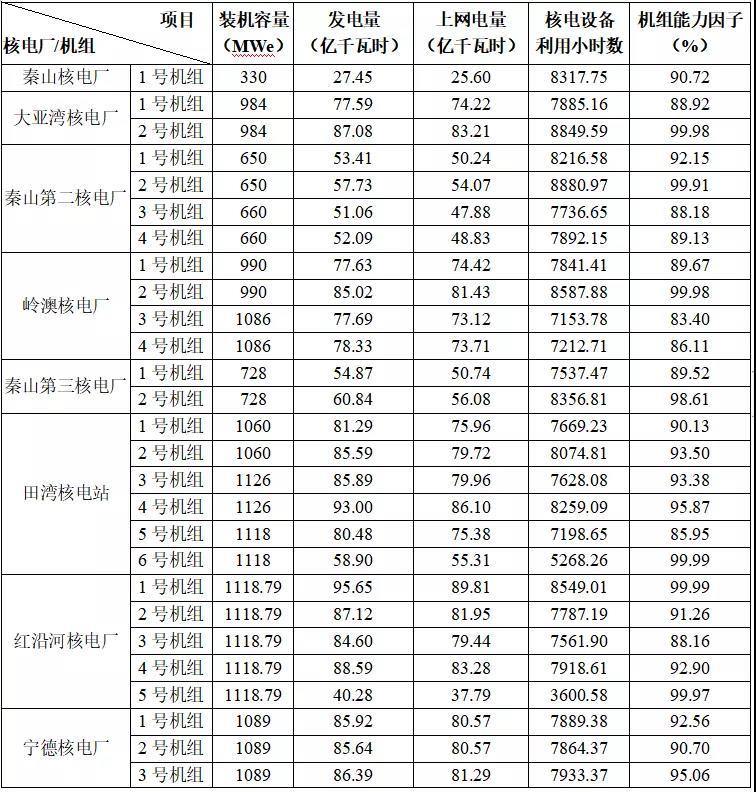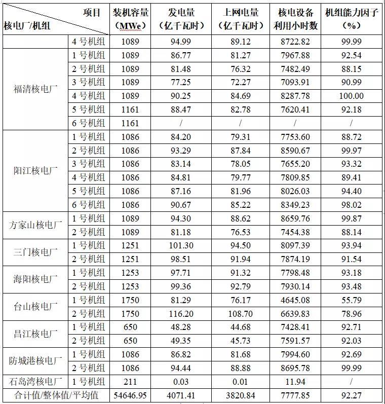 3) 本表最后一行“合計(jì)值/整體值/平均值”中,裝機(jī)容量、發(fā)電量、上網(wǎng)電量為各機(jī)組合計(jì)值,核電設(shè)備利用小時(shí)數(shù)為全部機(jī)組整體值,機(jī)組能力因子為全部機(jī)組的算數(shù)平均值。