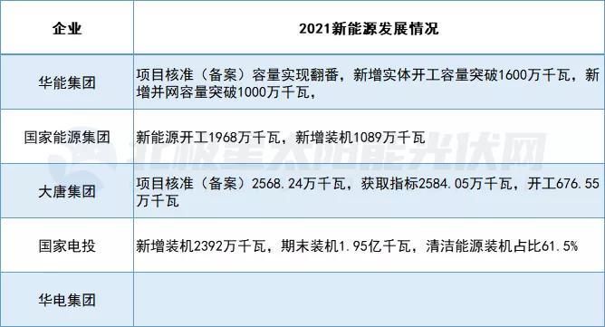 作為新能源領(lǐng)域的主力軍,五大發(fā)電集團(tuán)2021年在新能源領(lǐng)域的成績(jī)單也異常亮眼,公開數(shù)據(jù)顯示:2021年,華能集團(tuán)實(shí)現(xiàn)新能源新增并網(wǎng)超1000萬千瓦,實(shí)體開工超1600萬千瓦、國(guó)家能源集團(tuán)新能源開工1968萬千瓦,新增裝機(jī)1089萬千瓦、大唐集團(tuán)新能源項(xiàng)目核準(zhǔn)(備案)2568.24萬千瓦,獲取指標(biāo)2584.05萬千瓦......無一例外都創(chuàng)歷史最好水平。