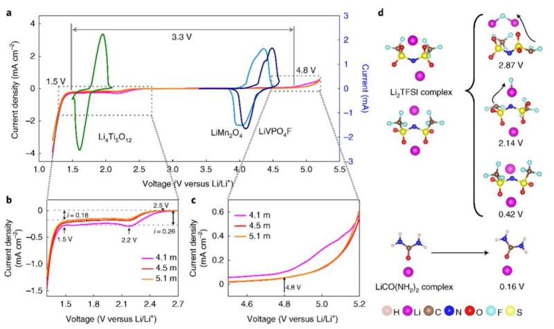 同時,高濃鹽本身也帶來了成本提高、電解液粘度增加等問題。于是,團隊便反其道而行,考慮降低鹽濃度,并提高電解液電壓窗口的辦法,這項最新發(fā)表的成果就是基于這個思路做出來的。