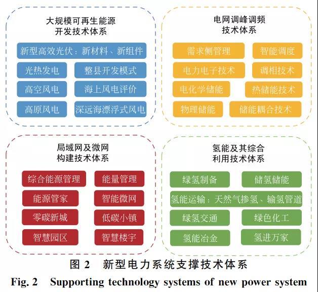 新型電力系統(tǒng)發(fā)展離不開支撐技術(shù)體系的進(jìn)步,新型電力系統(tǒng)的支撐技術(shù)體系可歸納為四大體系,分別是大規(guī)??稍偕茉撮_發(fā)技術(shù)體系、電網(wǎng)調(diào)峰調(diào)頻技術(shù)體系、局域網(wǎng)及微網(wǎng)構(gòu)建技術(shù)體系、氫能及其綜合利用技術(shù)體系,如圖2所示。