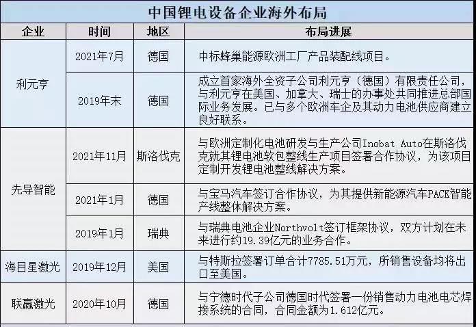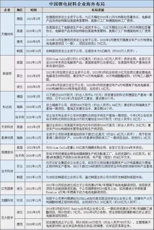 歐洲、美國電動化市場的快速崛起,動力電池企業(yè)大規(guī)模擴(kuò)產(chǎn)帶動材料及設(shè)備配套需求激增,一批具備“走出去”實力的中國鋰電企業(yè)相繼在全球建廠布局。