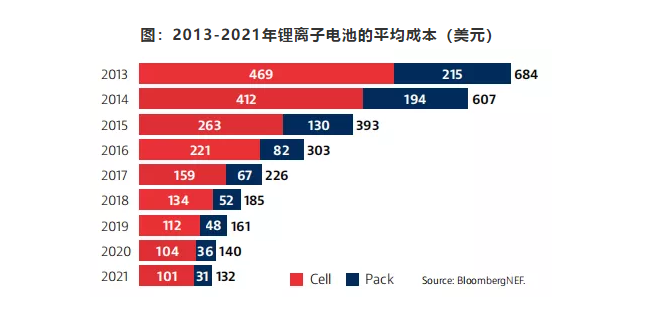 圖:2013-2021年鋰離子電池的平均成本(美元)