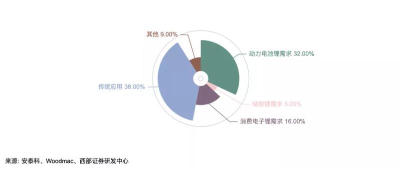 據(jù)統(tǒng)計(jì),2020年鋰的下游消耗在動力電池、儲能電池、消費(fèi)電子、其他傳統(tǒng)應(yīng)用領(lǐng)域分別為32%、5%、16%、38%,2025年動力電池領(lǐng)域的鋰消耗量占比預(yù)估將達(dá)到70%[4]。
