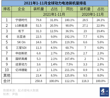 圖3:2021年1-11月全球動(dòng)力電池裝機(jī)量排名