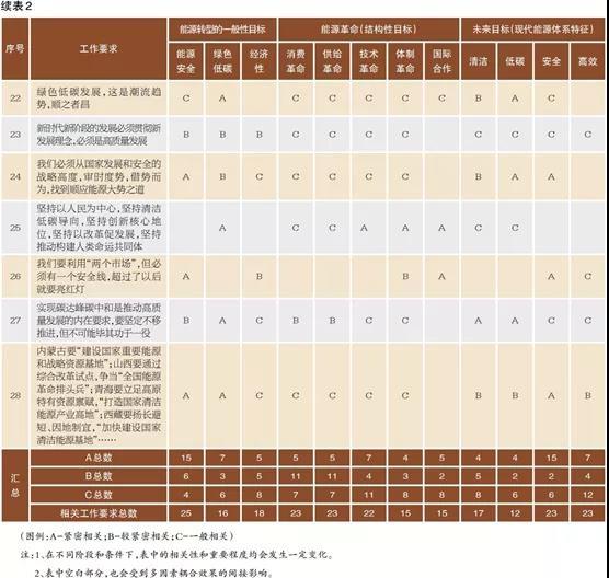 中國儲能網(wǎng)訊:1月7日,《人民日報》發(fā)表署名文章《能源的飯碗必須端在自己手里——論推動新時代中國能源高質量發(fā)展》,系統(tǒng)梳理了近年來黨中央關于能源安全、傳統(tǒng)能源和新能源發(fā)展、能耗“雙控”、能源技術創(chuàng)新和能源國際合作等多方面的工作要求(可總結為28條要求)。為了深入理解這28項工作要求對我國能源發(fā)展的具體指導方向與工作側重點,筆者從能源轉型目標、能源革命和能源未來目標三個方面對上述工作要求進行梳理與分析,并以相關性緊密程度形式呈現(xiàn)(見表,其中A表示緊密相關,B表示較緊密相關,C表示一般相關)。其中,能源轉型目標指出了現(xiàn)階段我國能源發(fā)展最應重視的方面與問題;能源革命指出了我國能源發(fā)展應采取的戰(zhàn)略路徑與重要措施;能源未來目標體現(xiàn)的是新時代我國新型能源體系應具備的特征。值得重視的是,我國在踐行“能源的飯碗必須端在自己手里”的進程中,需要堅持系統(tǒng)觀念并與時俱進,在處理多重關系的過程中,確保能源轉型適應經(jīng)濟社會發(fā)展需要,確保轉型進程中的能源安全。