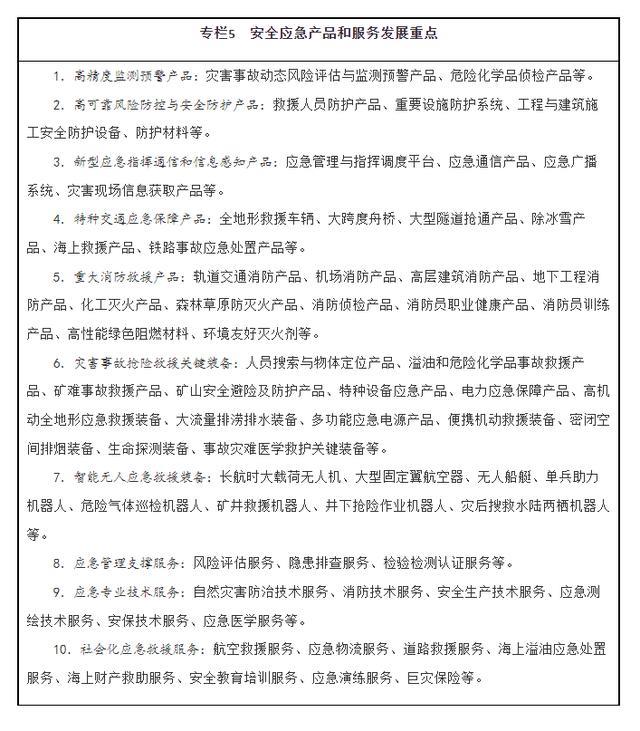 支持企業(yè)發(fā)展。引導企業(yè)加大應急能力建設投入,支持安全應急領域有實力的企業(yè)做強做優(yōu),培育一批在國際、國內市場具有較強競爭力的安全應急產(chǎn)業(yè)大型企業(yè)集團,鼓勵特色明顯、創(chuàng)新能力強的中小微企業(yè)利用現(xiàn)有資金渠道加速發(fā)展。