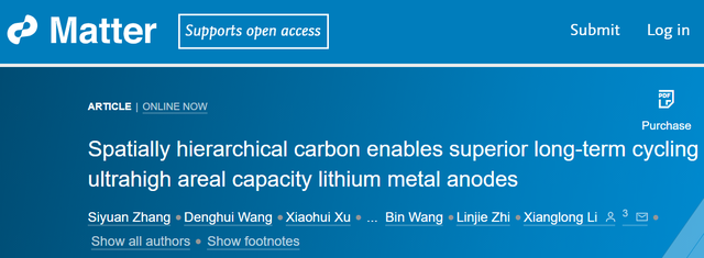 該項工作以“Spatially Hierarchical Carbon Enables Superior Long-Term Cycling of Ultrahigh Areal Capacity Lithium Metal Anodes”為題于2022年2月11日發(fā)表在Matter上,第一作者為國家納米科學(xué)中心博士研究生張思遠(yuǎn),通訊作者是李祥龍研究員。