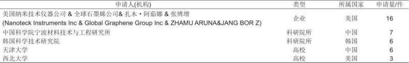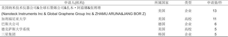 表6整理了在石墨烯超級電容器應(yīng)用領(lǐng)域提交PCT專利申請或向歐洲專利局提交專利申請或提交多國專利申請的專利申請人(機(jī)構(gòu))排名。