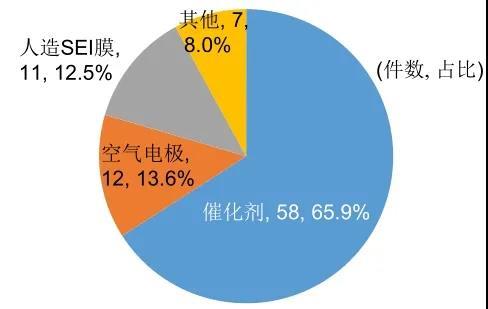 石墨烯主要應(yīng)用于鋰空氣電池的催化劑、空氣電極、人造SEI膜等領(lǐng)域。由圖23可以看出,石墨烯應(yīng)用于催化劑相關(guān)專利申請量最多,占比為65.9%。