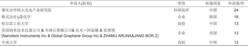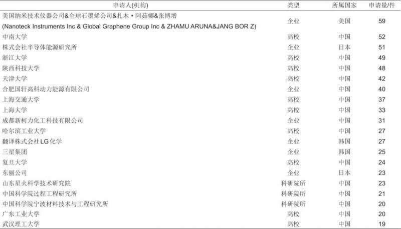 根據(jù)專利申請數(shù)量排名,整理出了排名前20的專利申請人(機(jī)構(gòu)),如表3所示。僅從申請數(shù)量上來看,排名靠前的專利申請人中有13位是來自中國的高校和科研院所。其中,中國科學(xué)院寧波材料技術(shù)與工程研究所劉兆平團(tuán)隊(duì)率先開展石墨烯鋰離子電池應(yīng)用研究,先后提出石墨烯導(dǎo)電漿料、涂炭集流體和石墨烯改性活性材料等研究思路。