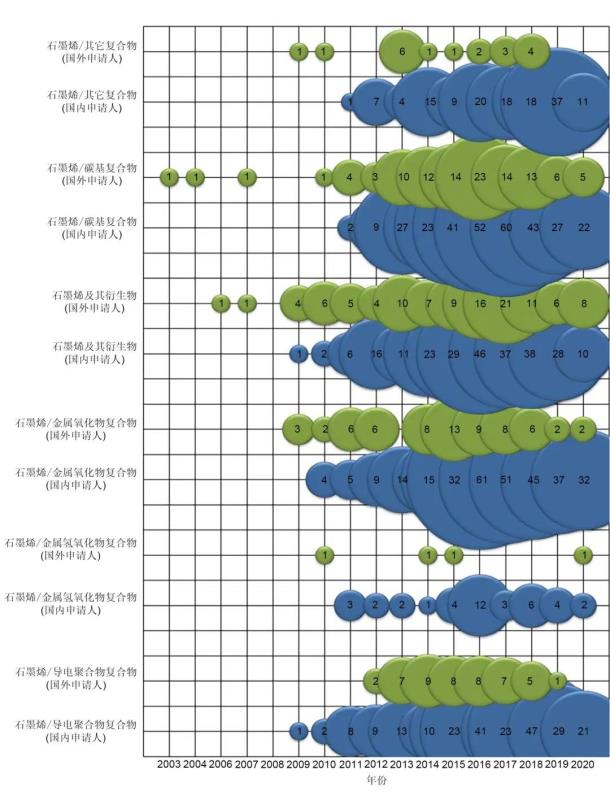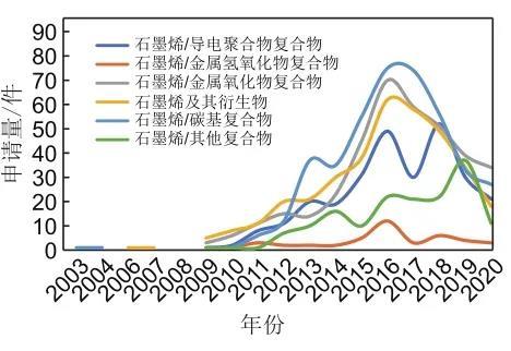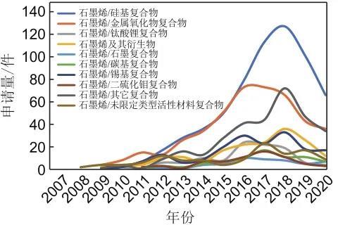 圖11 石墨烯在鋰離子電池各類負(fù)極中應(yīng)用的專利申請趨勢