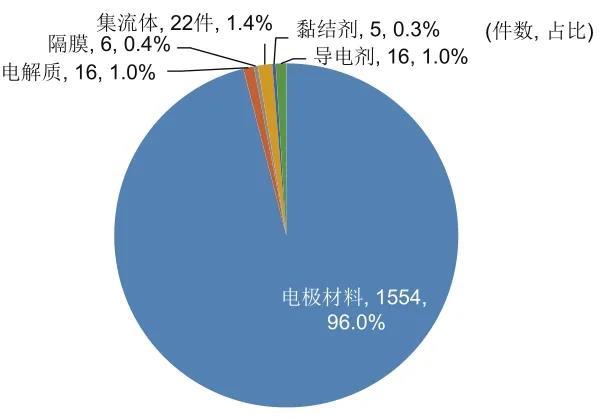 由圖15可知,在專利申請中,石墨烯主要應(yīng)用于超級電容器中的電極材料,占比達(dá)96.0%,另外有少量專利中石墨烯應(yīng)用于電解質(zhì)、隔膜、集流體、導(dǎo)電劑、黏結(jié)劑中。