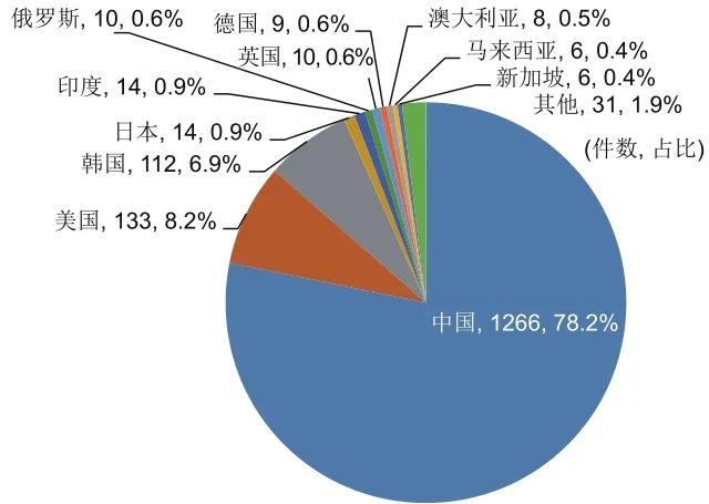 本文以第一申請人國籍作為專利申請來源國來分析專利技術(shù)起源地。如圖2所示,中國申請人在相關(guān)領(lǐng)域?qū)@暾埩孔疃啵急冗_(dá)82.4%。專利申請數(shù)量排名第二、第三的為美國、韓國,占比分別為7.3%和4.9%。日本、德國、印度也申請了一定數(shù)量的相關(guān)專利。