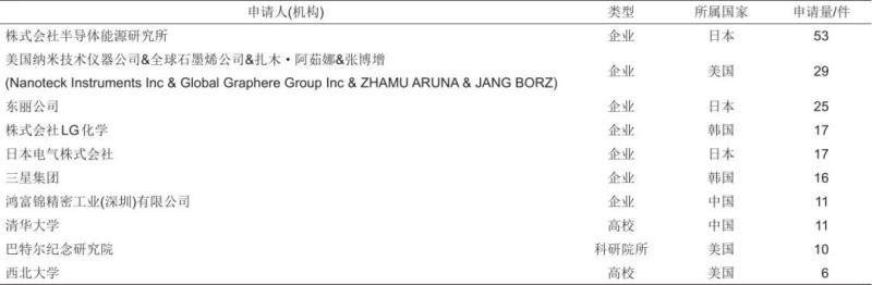 從表10可知,石墨烯在鈉離子電池領(lǐng)域?qū)@暾埩靠壳暗纳暾埲司鶠閬碜灾袊母咝?,其中以陜西科技大學(xué)申請數(shù)量最多,該校曹麗云團(tuán)隊(duì)共申請相關(guān)專利15件。這也從側(cè)面說明,對于石墨烯在鈉離子電池領(lǐng)域的應(yīng)用,目前仍處于實(shí)驗(yàn)室研究階段,相關(guān)技術(shù)從實(shí)驗(yàn)室跨越到大規(guī)模的工業(yè)應(yīng)用仍需時(shí)日。